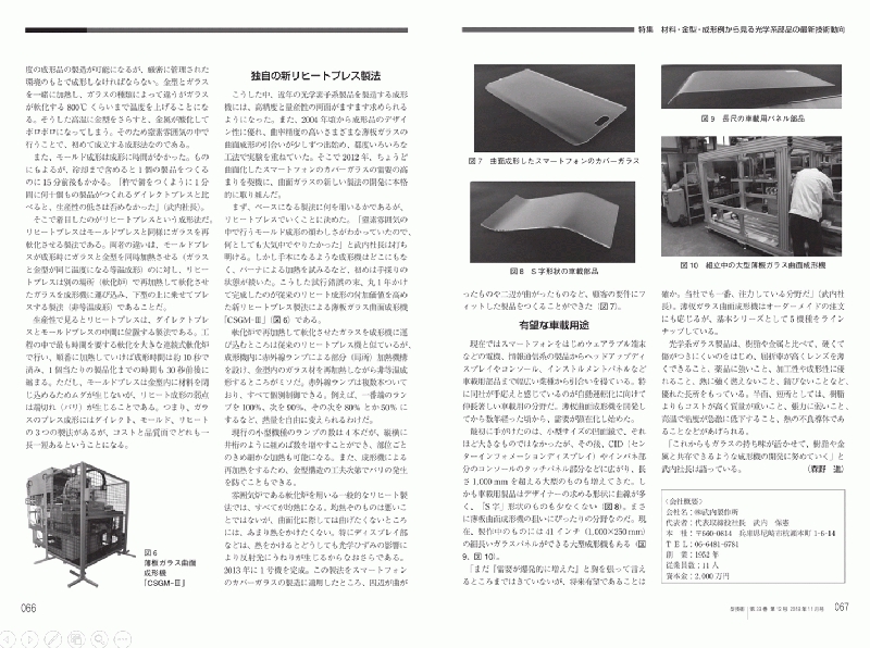 Our own new reheat press manufacturing method for forming curved thin glass technology was introduced on the“Kata Gijyutsu”(means Mold Technology), published by the Nikkan Kogyo Shimbun in November 2018.