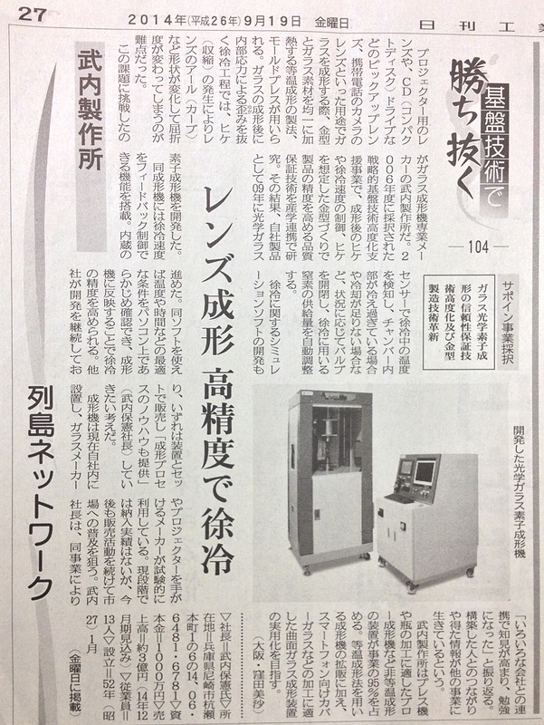 武内製作所はプレス機や瓶の加工に適したブロー成形機など非等温成形の装置が事業の95%を占める。等温成形法を用いる成形機の拡販に加え、スマートフォン向けカバーガラスなどの加工に適した曲面ガラス成形装置の実用化を目指す。