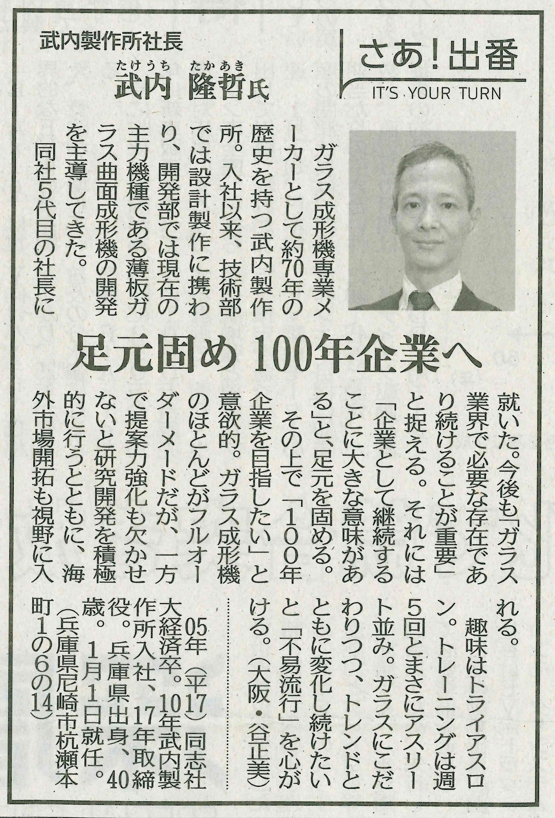 お知らせ ホーム お知らせ 日刊工業新聞に掲載されました。 2021.02.08 お知らせ 日刊工業新聞に掲載されました。 日刊工業新聞の「さあ!出番」欄に、当社代表取締役社長武内隆哲のインタビュー記事が掲載されました。 ガラスにこだわりつつ、トレンドと共に変化し続けてまいります。 次の記事へ 一覧へ戻る 前の記事へ